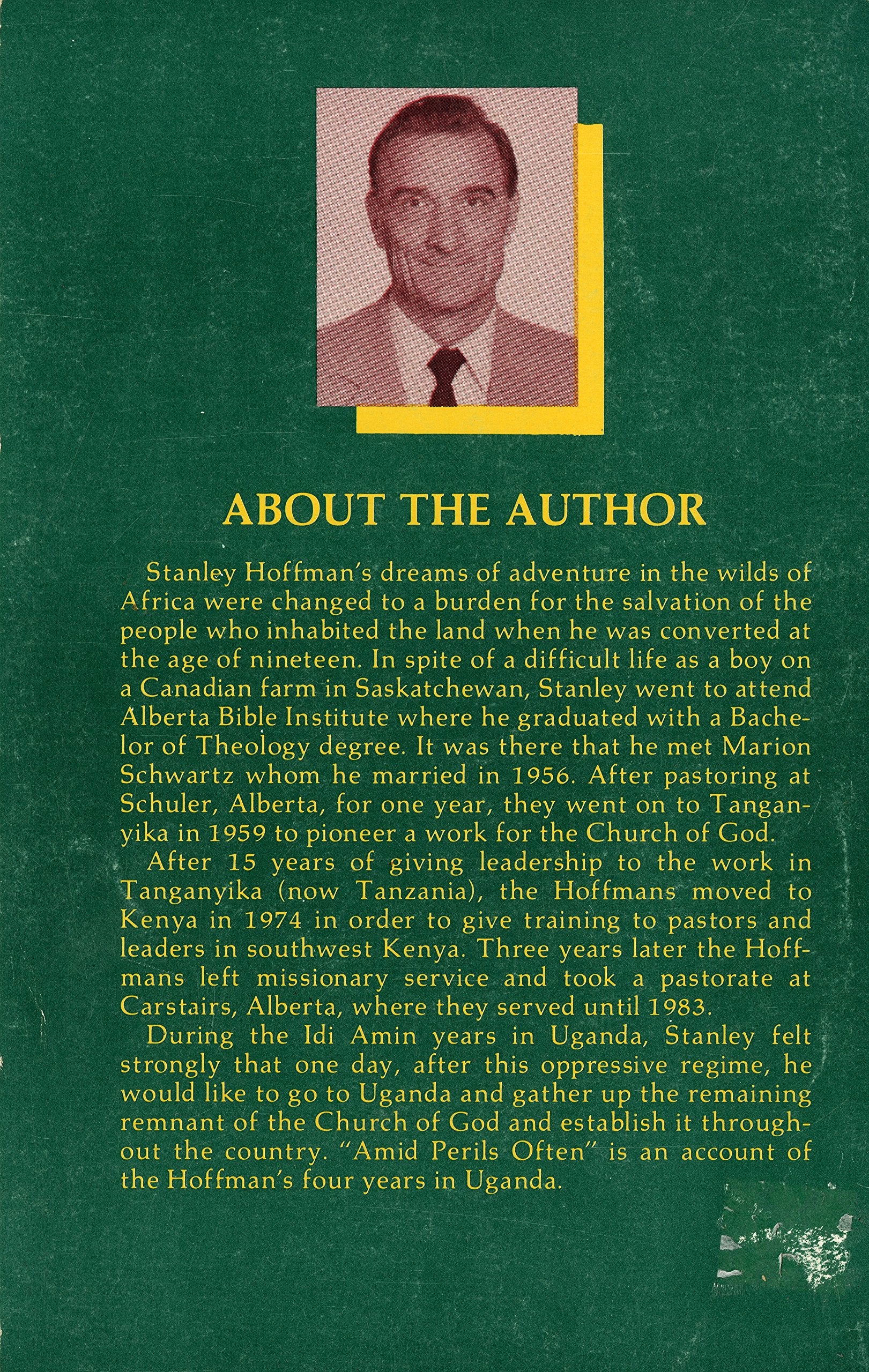 During the Idi Amin years in Uganda, Stanley felt strongly that one day, after this oppressive regime, he would like to go to Uganda and gather up the remaining remnant of the Church of God and establish it throughout the country. “Amid Perils Often” is an account of the Hoffman’s four years in Uganda.