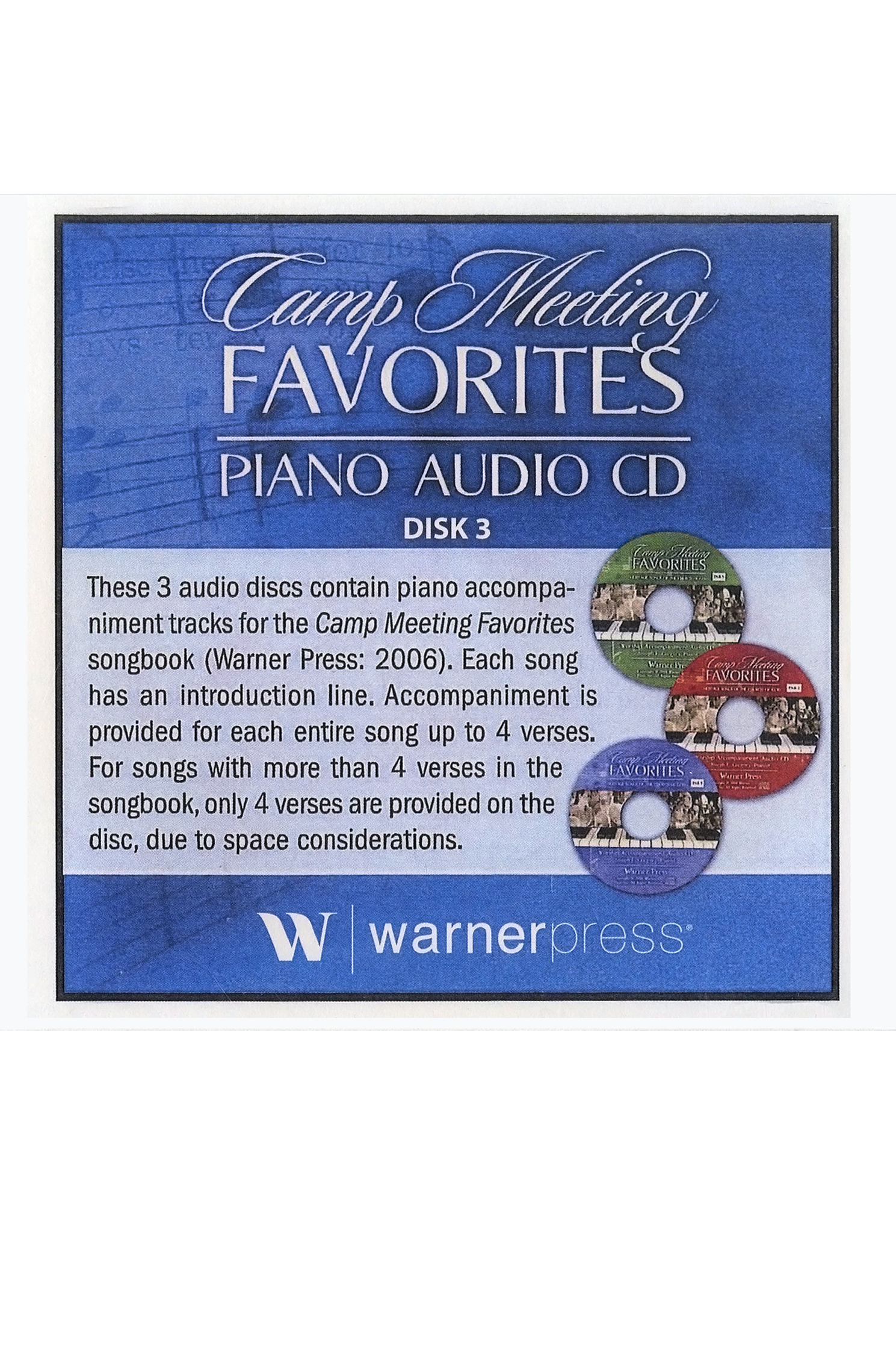 These 3 audio discs contain piano accompaniment tracks for the Camp Meeting Favorites songbook (Warner Press: 2006). Each song has an introduction line. Accompaniment is provided for each entire song up to 4 verses. For songs swith more than 4 verses in the songbook, only 4 verses are provided on the disc, due to space considerations.