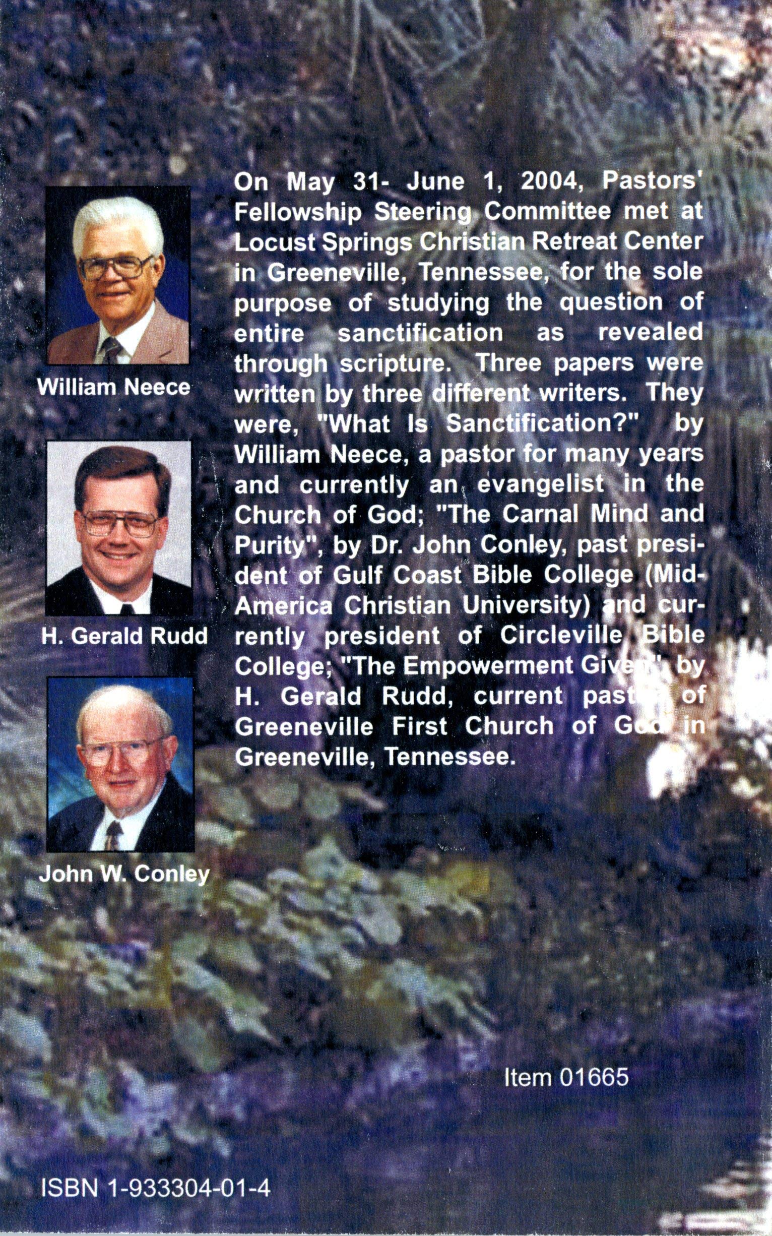 On May 31-June 1, 2004, the Pastors’ Fellowship Steering Committee met at Locust Springs Christian Retreat Center in Greeneville, Tennessee, for the sole purpose of studying the question of entire sanctification as revealed through scripture. Three papers were written by three different writers. They were, “What Is Sanctification?” by William Neece, a pastor for many years and currently an evangelist in the Church of God; “The Carnal Mind and Purity,” by Dr. John Conley, past president of Gulf Coast Bible College (Mid-America Christian University) and current president of Circleville Bible College; and “The Empowerment Given,” by H. Gerald Rudd, current pastor of Greeneville First Church of God in Greeneville, Tennessee. The individuals who were present besides the writers were Wayne Absher, Frank Curtis, David Devoll, Danny Goins, Jack Harper, Bob Hefner, Allan Hutchinson, Harry Mullins, Don Neace, and Ralph Shupe. The purpose of the meeting was to come to a common understanding about the question of entire sanctification. Presenters had two hours to present their papers and to allow for discussion. At the end of that time, there was a general agreement that these papers are representative of the Biblical teaching on this subject.