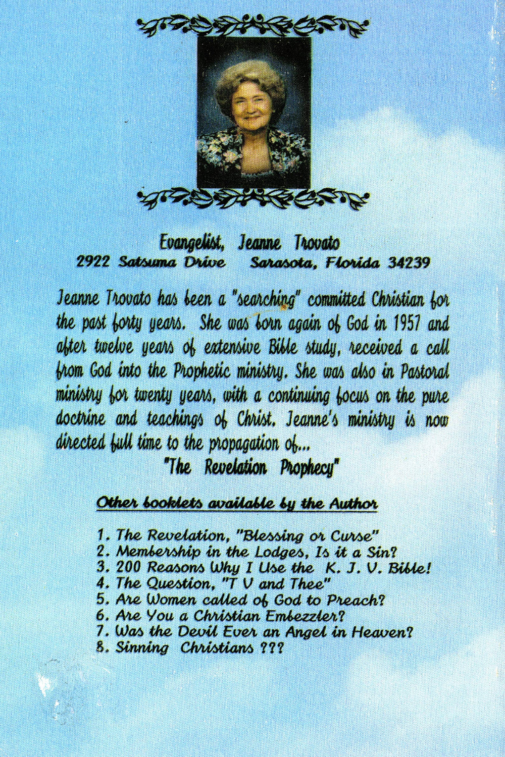 Jeanne Trovato has been a “searching” committed Christian for the past forty years. She was born again of God in 1957 and after twelve years of extensive Bible study, received a call from God into the Prophetic ministry. She was also in Pastoral ministry for twenty years, with a continuing focus on the pure doctrine and teachings of Christ. Jeanne’s ministry is now directed full time to the propagation of . . . “the Revelation Prophecy.”